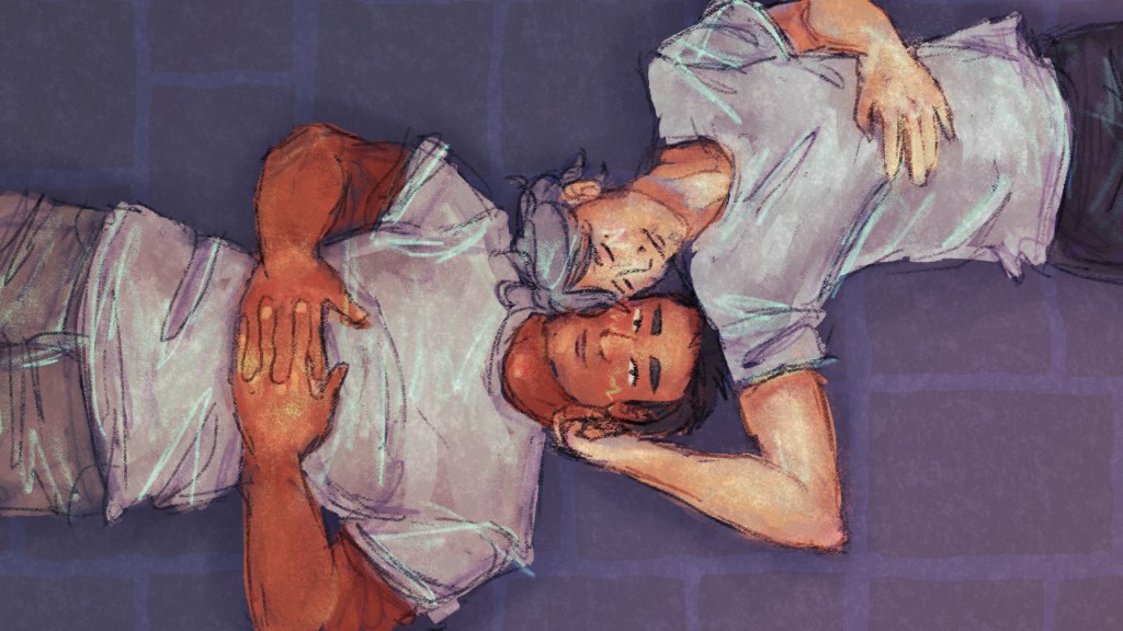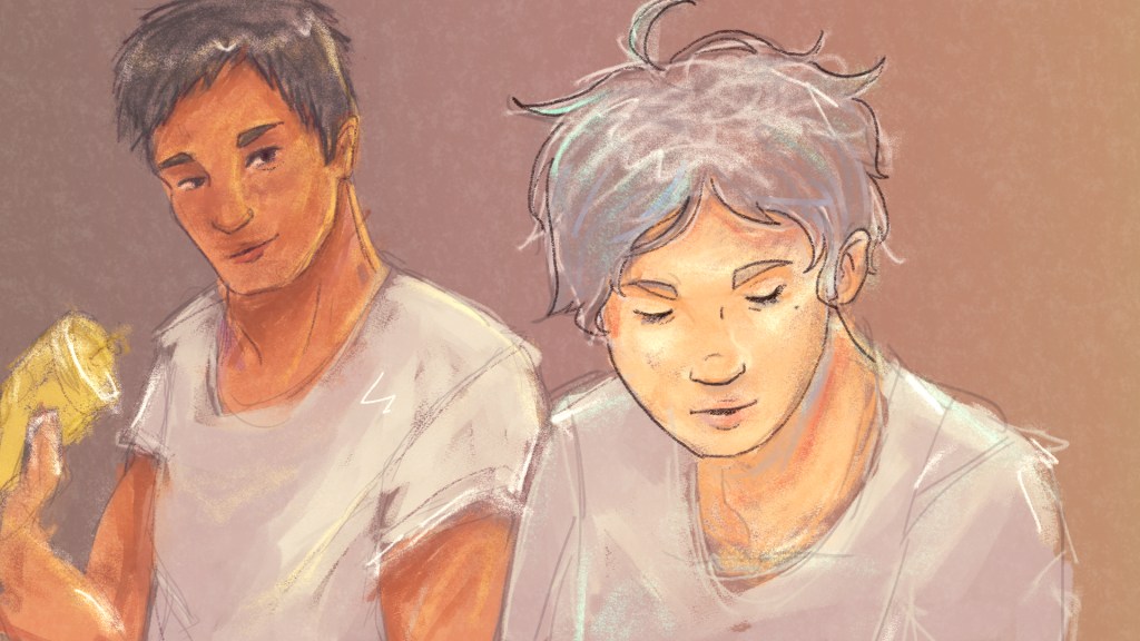 this piece was… an accident. piper asked what way daisuga should be lying down, i found a reference image, and then was immediately obsessed with the specific body language of that image. here we are.