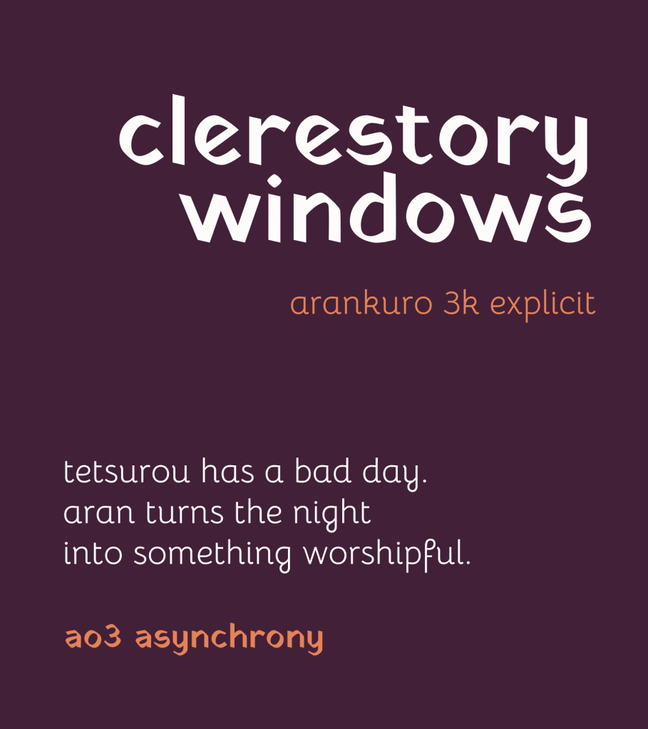 clerestory windows christened the aran/kuroo tag and boy is it hot. religious imagery, kuroo’s narrow fucking waist and aran’s massive fucking hands. that’s it, that’s the fic.
