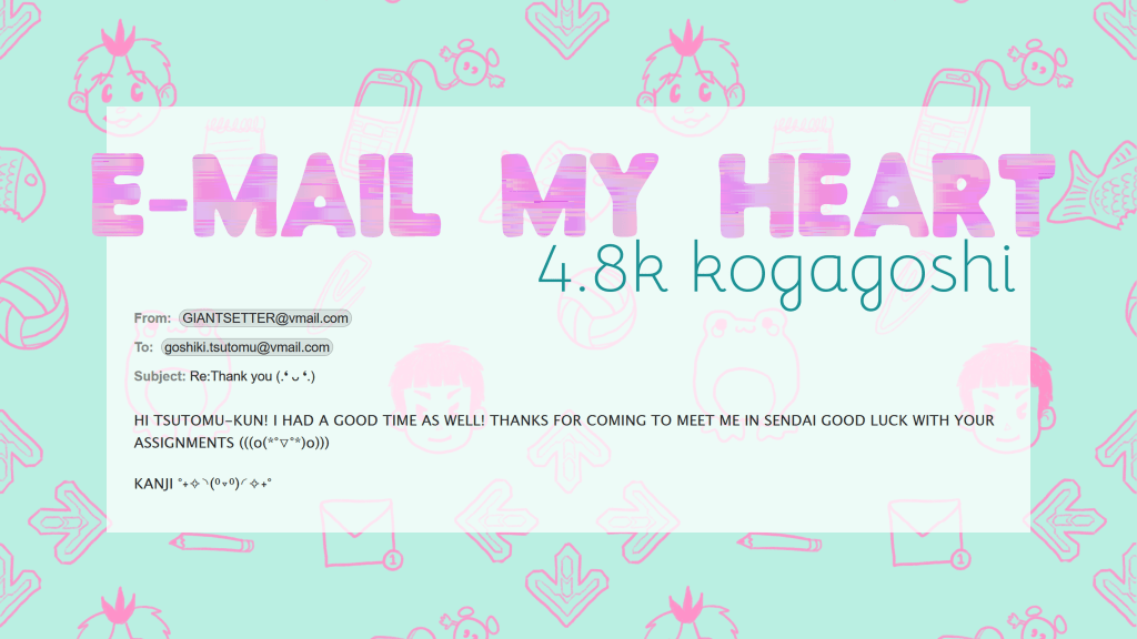 email my heart is full of, well, heart and teenage first-crush romance between two of our most sincere and awkward boys. koganegawa and goshiki make it work!