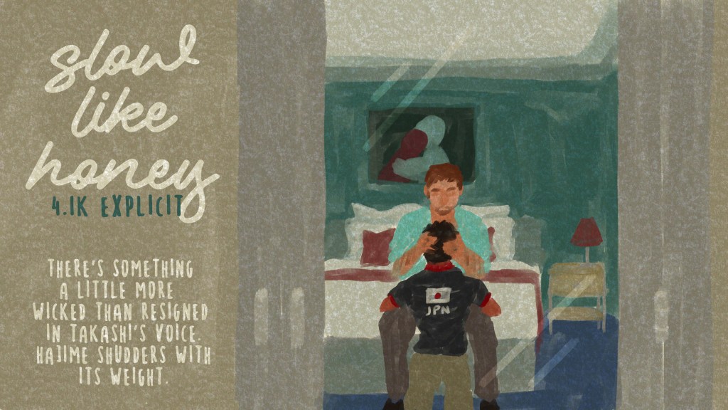 slow like honey. well. iwaizumi/utsui (that’s ushijima’s dad, by the way). a really complicated, really queer cross-generation relationship, mediated by mirrors and being afraid of what others (or you) see in your relationship. also: sexual tension, the fic. the most excruciating of slow burns, packed into a 4k fic that spans ten years.