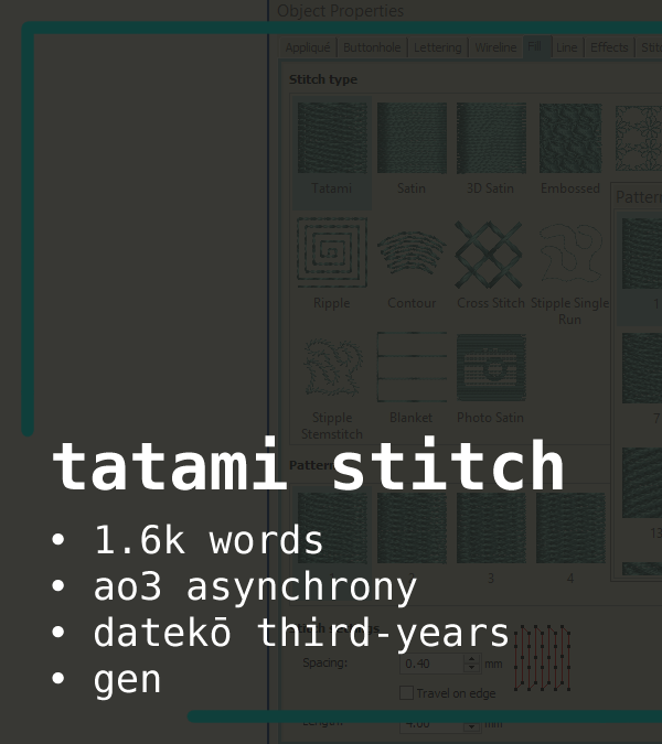 tatami stitch sketches out the datekō third-years as first-years. what it means to go to a technical school, class and otherwise. what it means to work with your hands in a way other students don’t. what it means to build the iron wall.