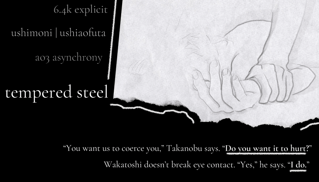 tempered steel my beloved. whumpy consensual-non-consent (rape roleplay), established ushijima/moniwa and aone/futakuchi relationships, with aone and futakuchi destroying ushijima and moniwa, crucially, putting him back together.