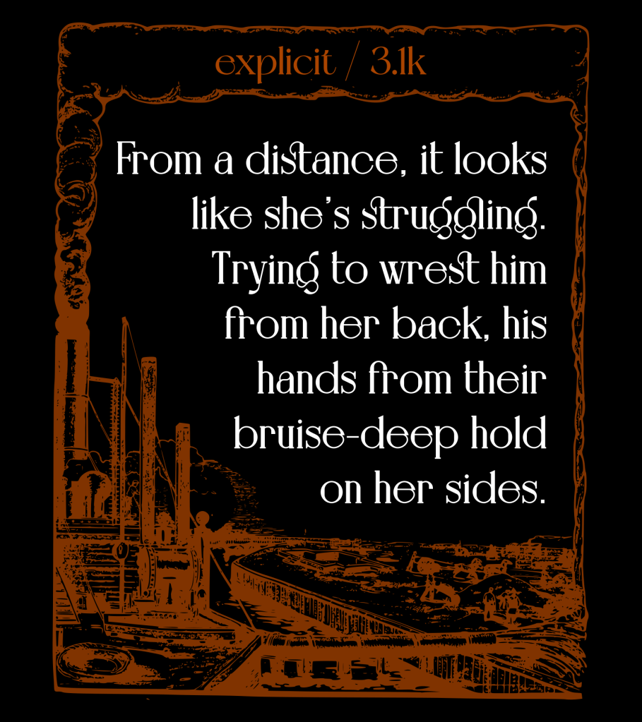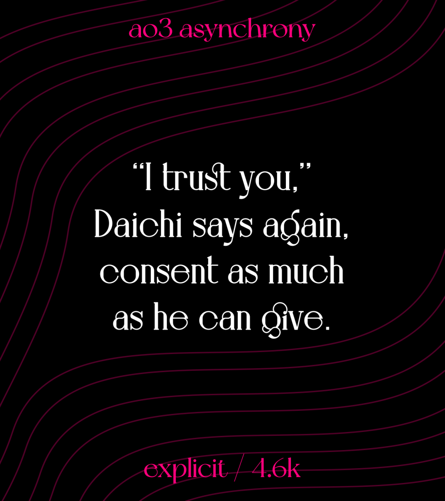 okay, this is cheating a little. from the concrete is a series about trans people in a dystopia, in situations where consent is conditional (because, well, it’s a dystopia). i’m very proud of all of these fics; my most beloved readers assure me they’re hot and complicated and affirming and terrifying at the same time.